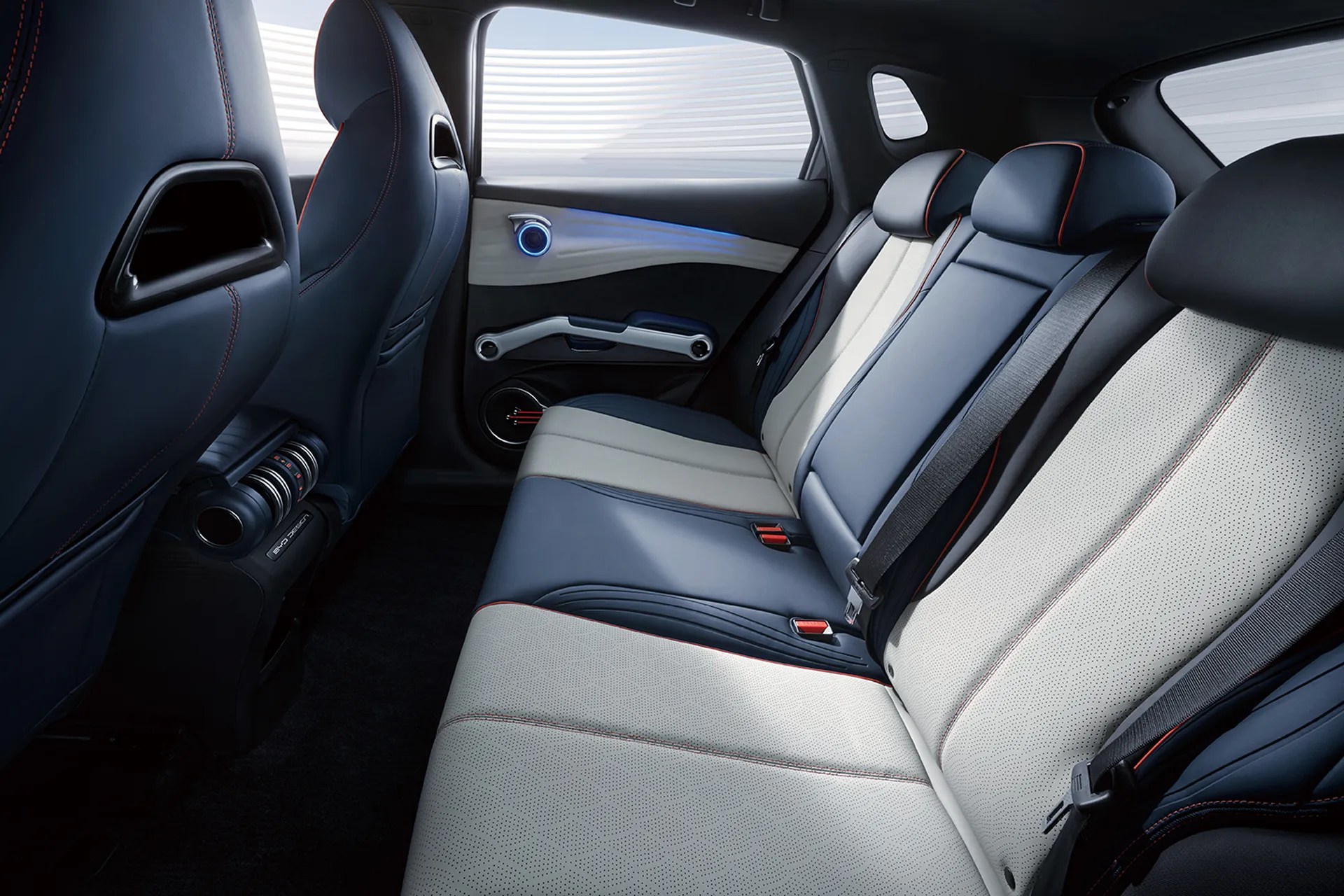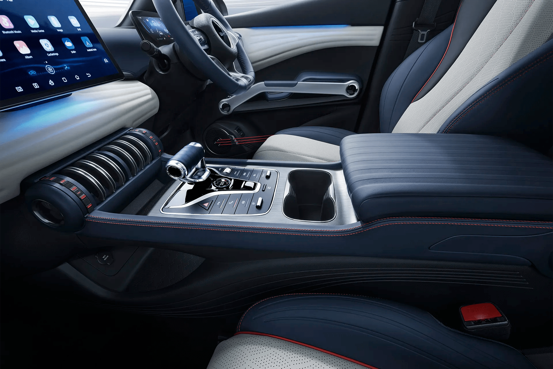 The integrated sports seats offer long-distance comfort as well as strong lateral support during cornering. These seats are made from sustainabThe futuristic suspended centre console design creates a modern, dynamic driving environment with its metal trim detail that runs across the entire dashboard, forming a beautiful, minimalist curved surface.le vegan leather, offering an eco-friendly solution without compromising on style. With multiple-way adjustment, you can customize your seat to your every need.